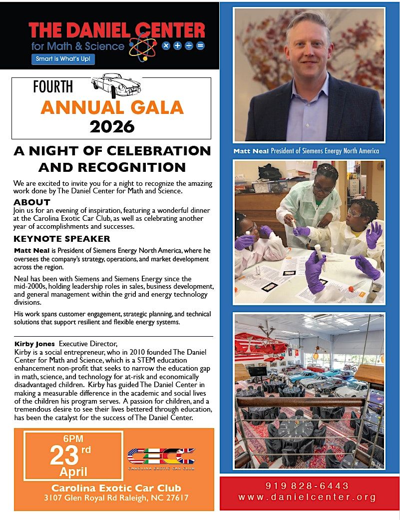 Join us on April 23rd at 6:00 PM at the Carolina Exotic Car Club (3107 Glen Royal Rd, Raleigh, NC 27617) for an elegant dinner and a celebration of another year of student achievements, growth, and success.