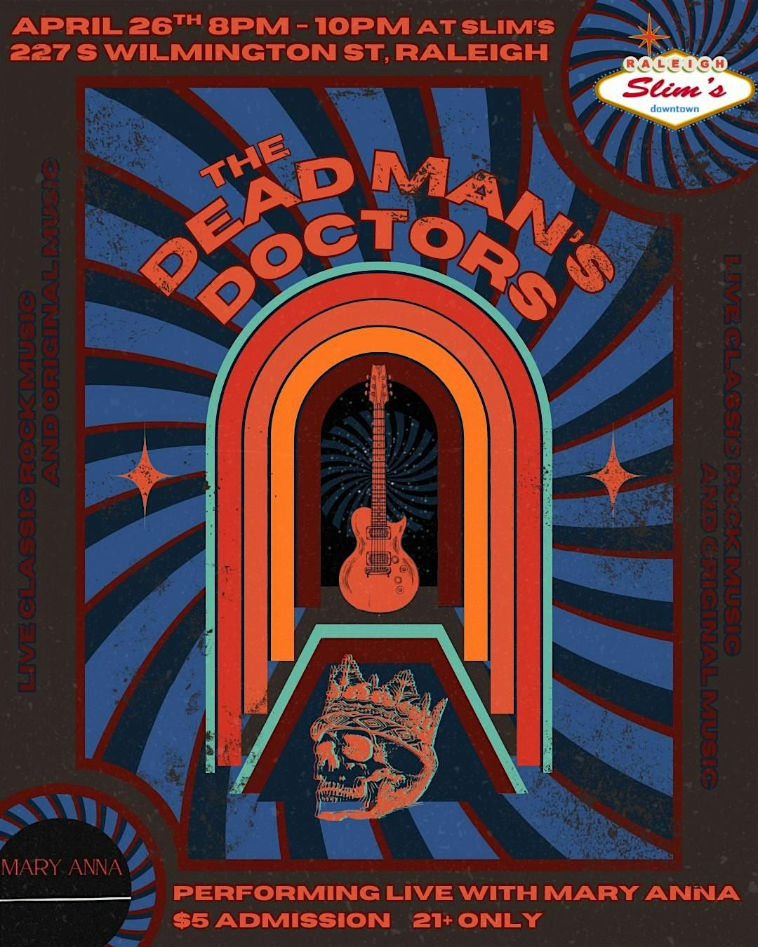 The Dead Man’s Doctors and Mary Anna are playing at Slim’s on April 26th, 8-10pm! The Dead Man’s Doctors is a classic rock revival band. Joining the set is noisy post-grunge band, Mary Anna!