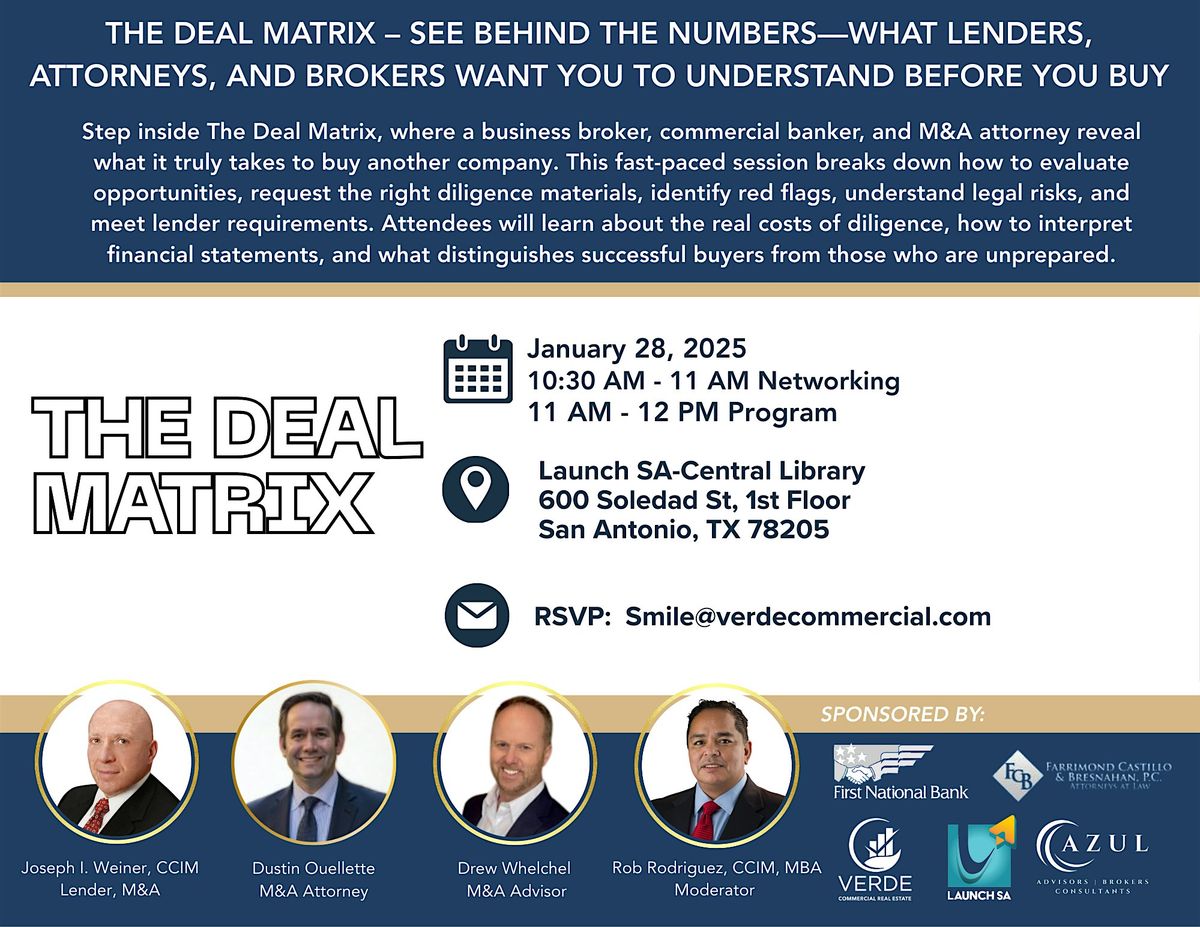 Step inside The Deal Matrix, where a business broker, commercial banker, and M&A attorney reveal what it truly takes to buy another company. This fast-paced session breaks down how to evaluate opportunities, request the right diligence materials, identify red flags, understand legal risks, and meet lender requirements. Attendees will learn about the real costs of diligence, how to interpret financial statements, and what distinguishes successful buyers from those who are unprepared.