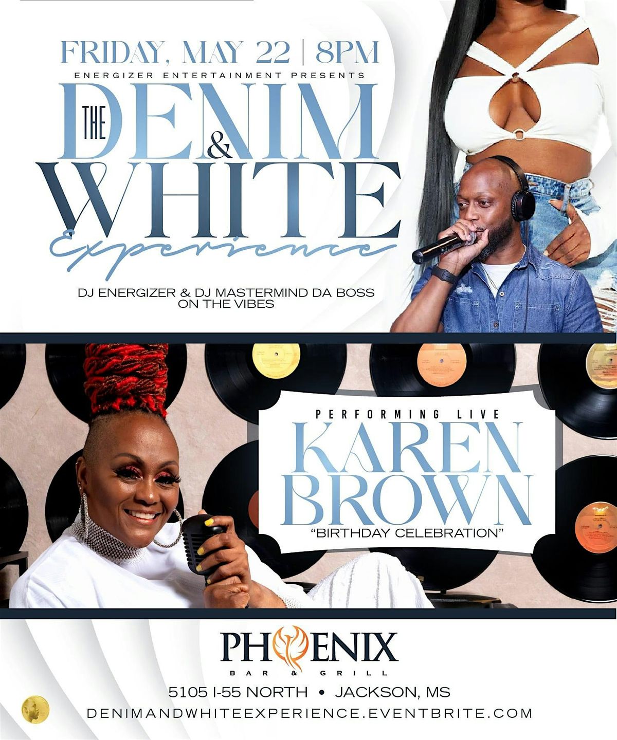 Get ready for a night of style, sound, and unforgettable vibes at the DENIM & WHITE Experience. This elevated event brings together a fashionable crowd dressed in crisp white and classic denim for an evening filled with live entertainment and high-energy music. Enjoy a soulful live performance by Karen Brown and DJ Energizer on the vibes.