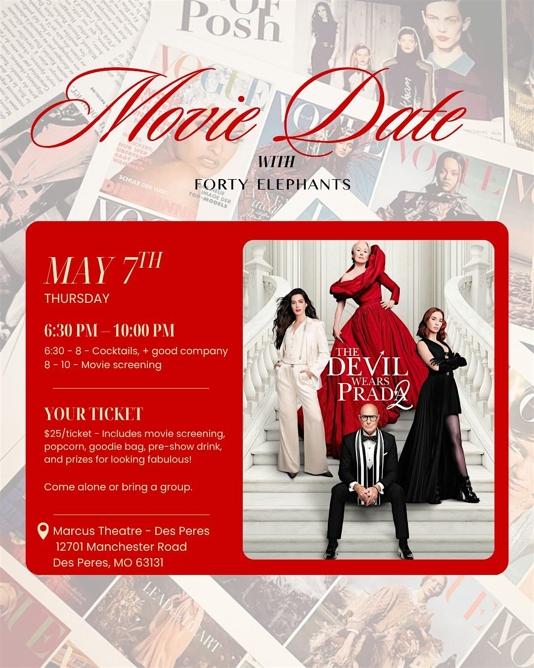 Join Forty Elephants for a private screening of The Devil Wears Prada 2 on May 7 at Marcus Theatre – Des Peres.