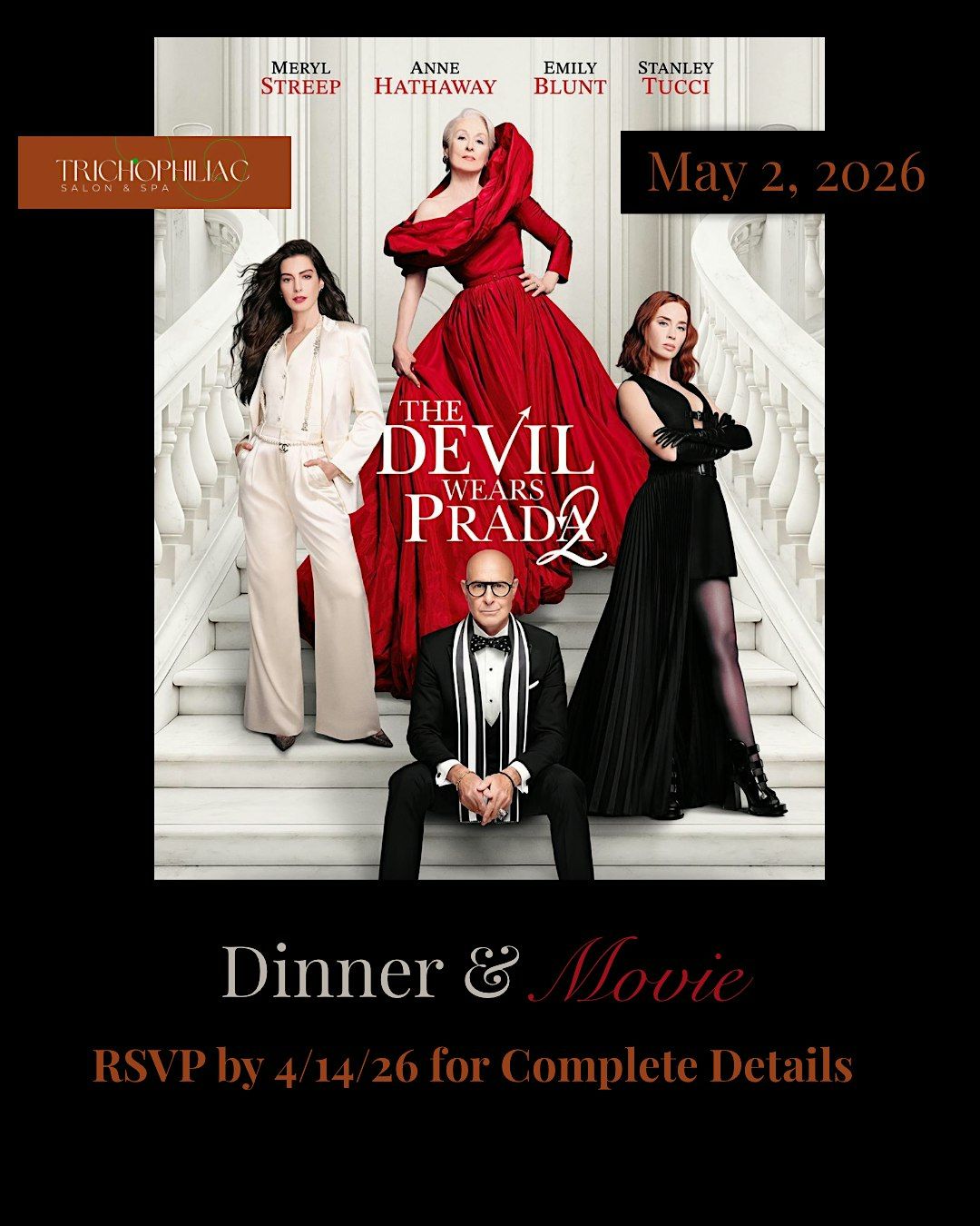 The Ladies of Trichophiliac Salon will set to the town in fashionable attire to enjoy a tasty dinner and viewing of The Devil Wears Prada 2