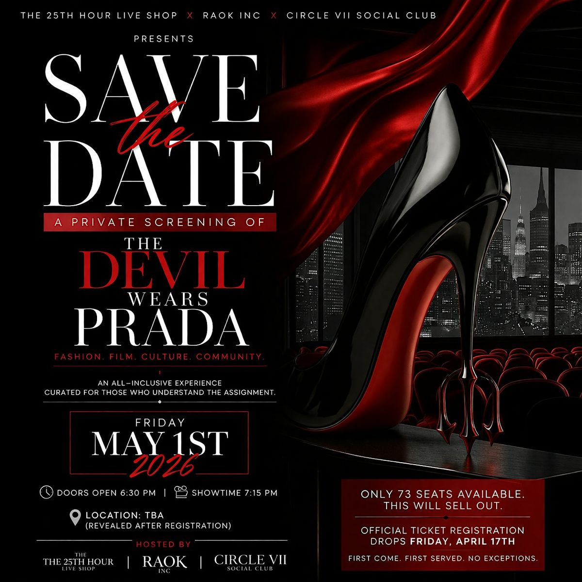 Guests will enjoy a private screening, curated dining, themed cocktails, champagne service, and a luxury-inspired atmosphere created by The 25th Hour Live Shop.