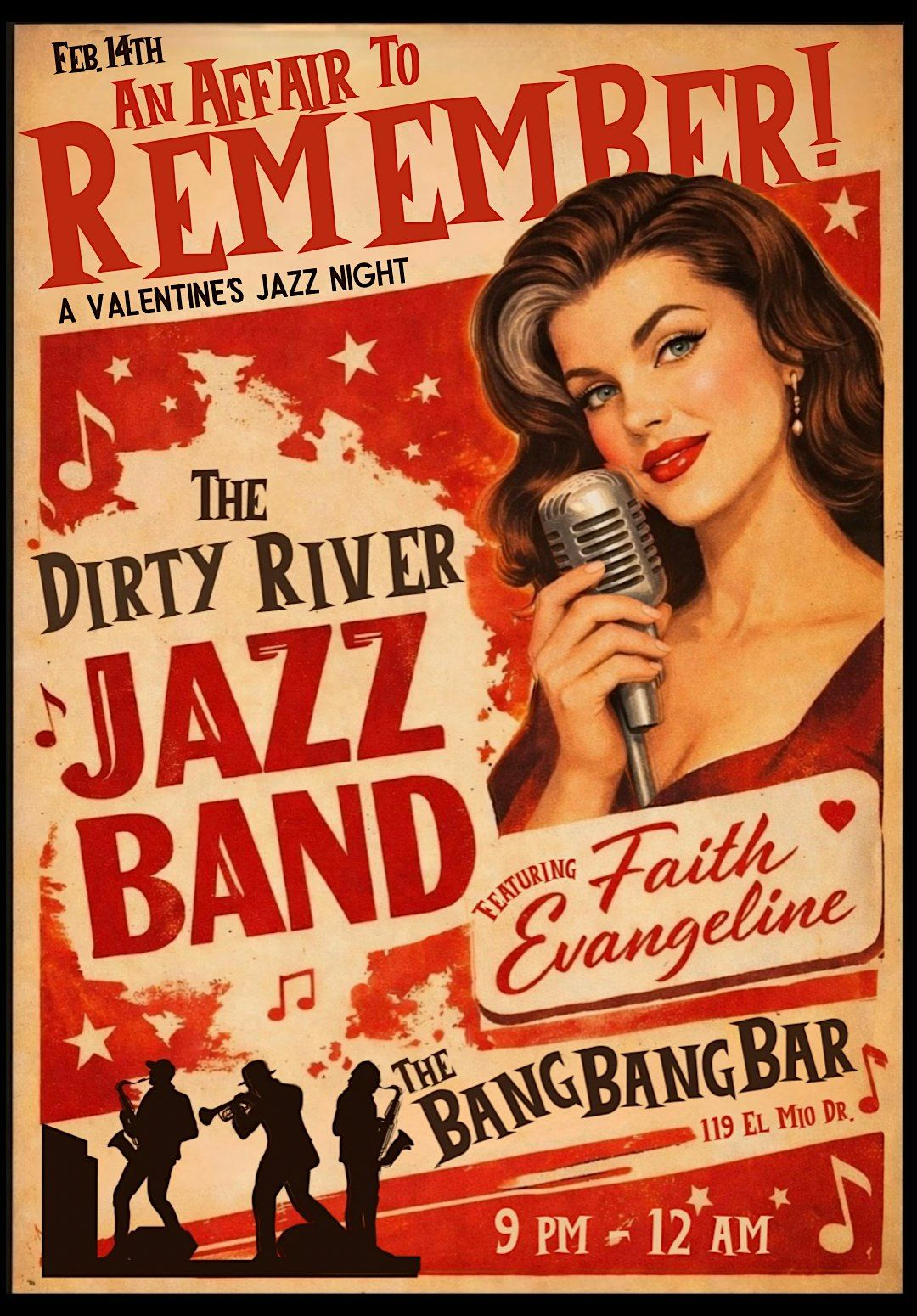 Join us for a late-night jazz set with The Dirty River Jazz Band, featuring Faith Evangeline. Classic jazz, smoky vocals, and an atmosphere that fits Bang Bang after dark.