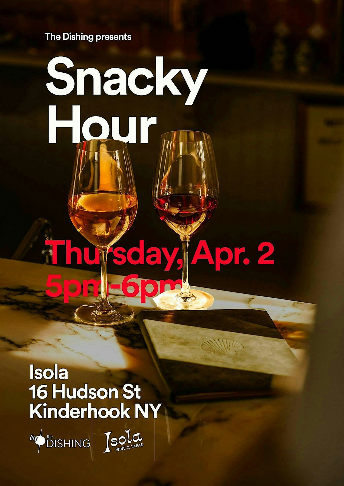 The Dishing presents Snacky Hour on April 2 with sommelier Hillary Zio at her pretty little wine bar, Isola, in Kinderhook. Snacky Hour is a free, early social hour from 5 to 6 p.m. so you can drop in + taste something new, but with CIA-trained chef Mykaela Summers in the kitchen, we highly recommend staying for small plates or dinner.