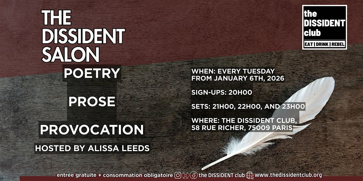 The Dissident Salon is a weekly poetry and performance series created as an extension of the DISSIDENT Club’s mission to provide a home for dissenting voices, hosted by Alissa Leeds. Rooted in the tradition of the literary salon, it treats writing and performance as public acts that question power and challenge the systems that shape our lives.