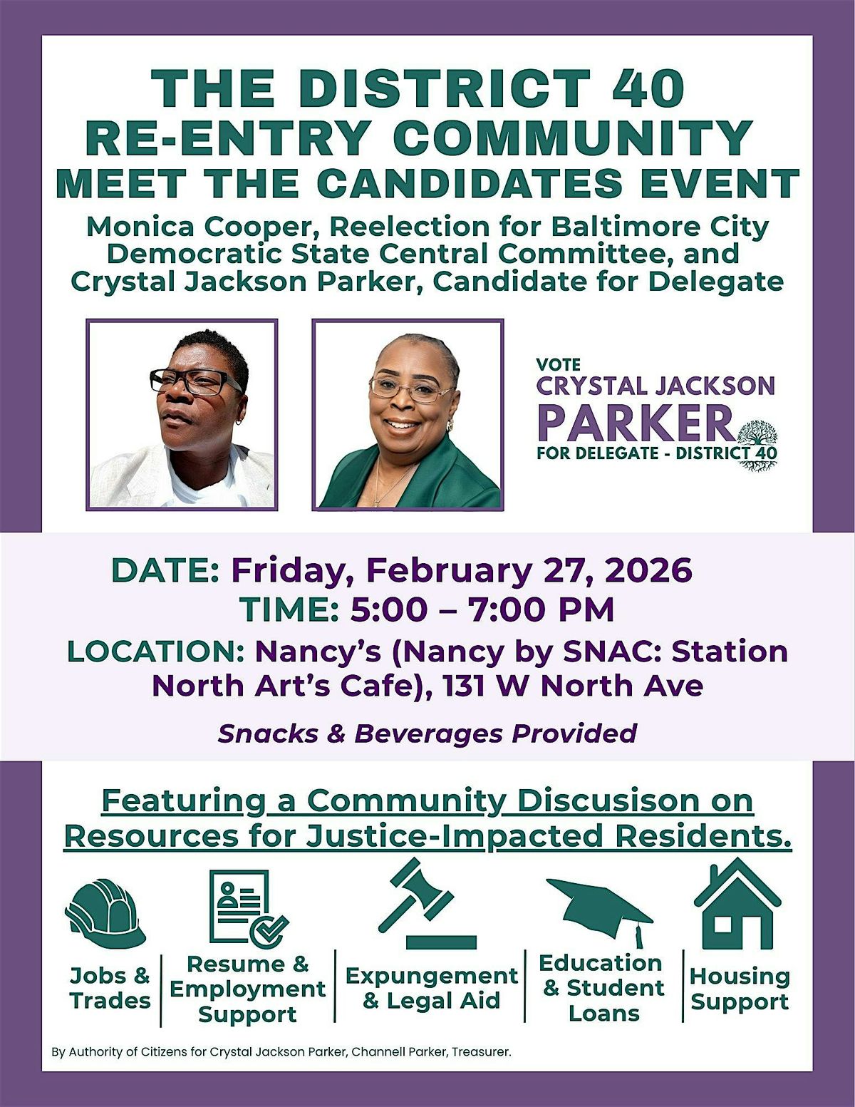 Snacks and solutions for justice-impacted residents. We’ll discuss jobs, expungement and legal aid, education, and housing support.About this Event