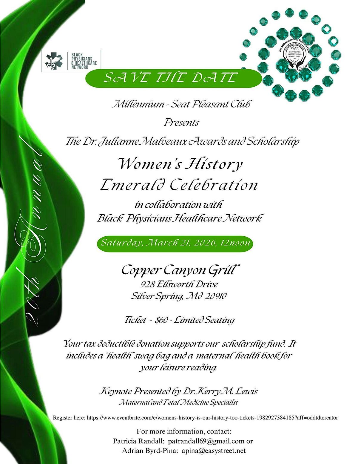 Your tax deductible donation supports our scholarship fund. It also includes a delicious meal, a “health” swag bag and a book on maternal health for your leisure reading. This event is presented by The National Association of Negro Business and Professional Women's Clubs, Inc., Millennium-Seat Pleasant Club in partnership with The Black Physicians Healthcare Network of Montgomery County, MD.