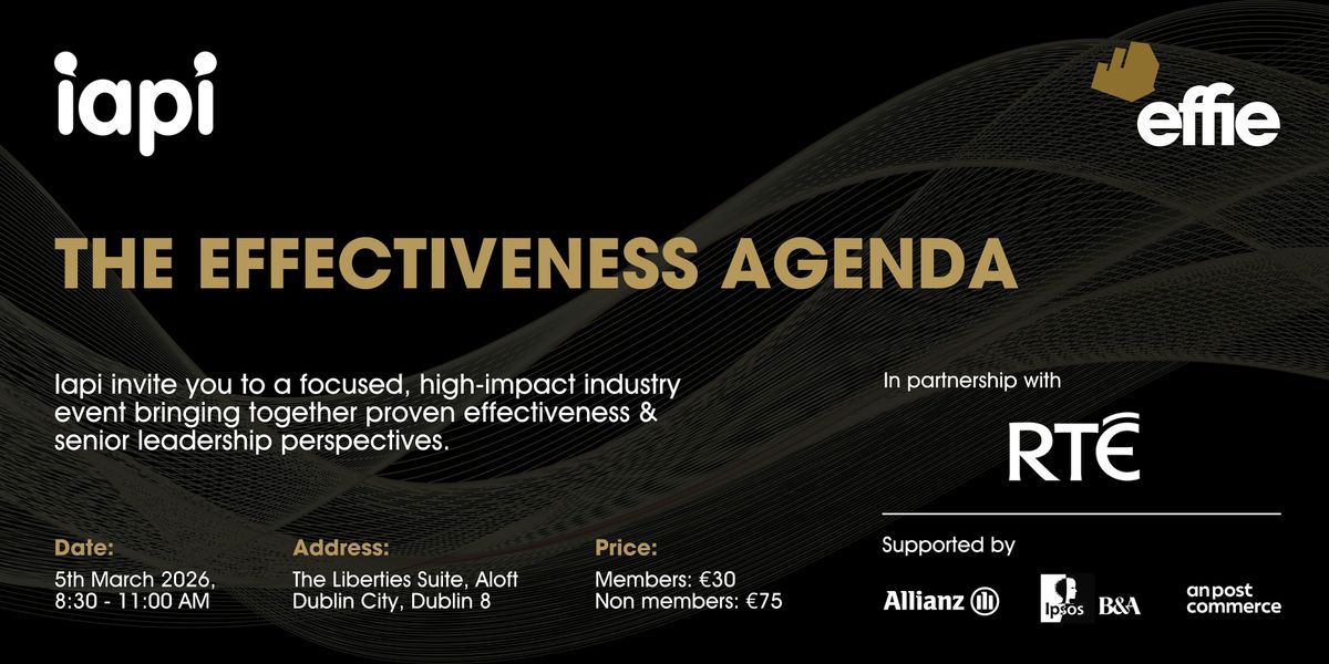 Siobhán Masterson, CEO, will provide an overview of Iapi’s new biennial Effie model, outlining the Effectiveness Foundation Year and how the industry will engage with effectiveness through a dedicated learning and thought leadership year-long programme culminating with The Culture of Effectiveness conference on 20th October 2026. We will then see the return of the Effie Awards Ireland in 2027.
