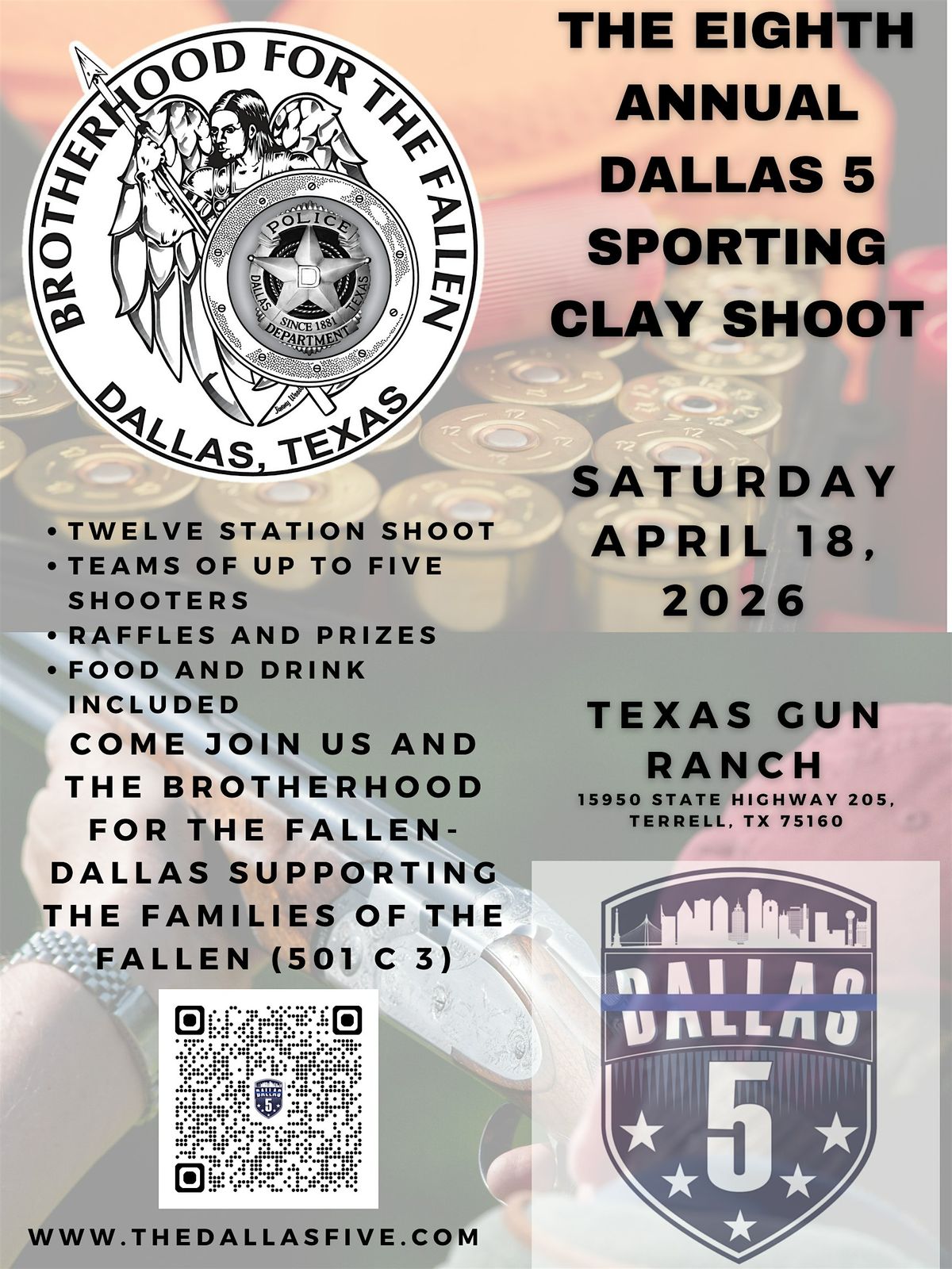 - This is our EIGHTH Dallas Five Sporting Clay Shoot, and we couldn't be more proud to again partner with the Brotherhood For The Fallen - Dallas to bring you this amazing event!