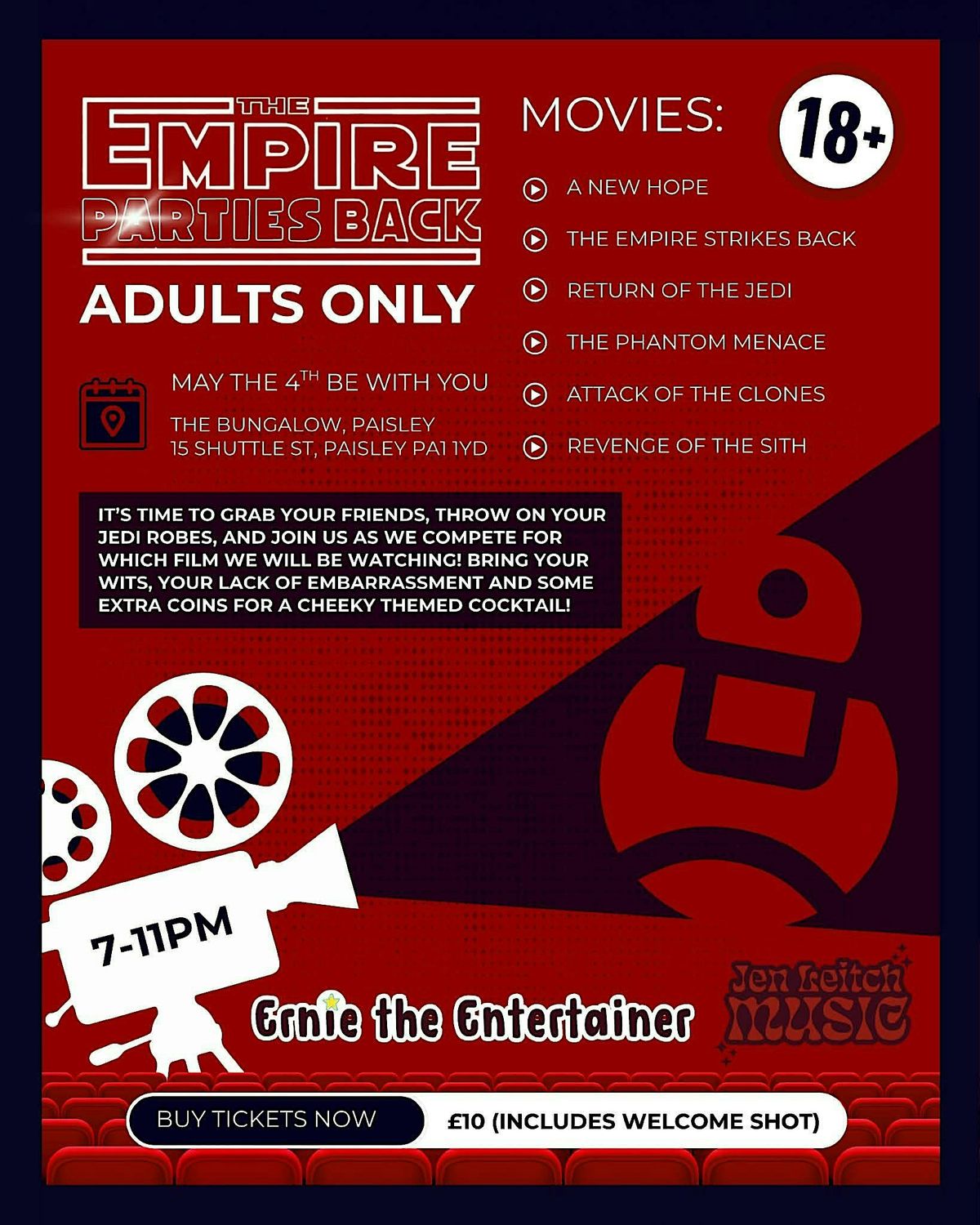 MAY THE FOURTH BE WITH YOU! Join us for THE EMPIRE PARTIES BACK – where we shall BATTLE to determine what movie we will watch!About this Event