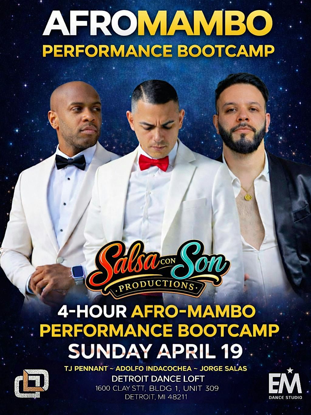 Step into the world of Afro-Mambo at the Performance Bootcamp on April 19 at Detroit Dance Loft! This 4-hour immersive experience brings together world-class instructors Adolfo Indacochea, Jorge Salas, and TJ Pennant for an electrifying journey through rhythm, technique, and performance. Dancers will dive deep into Afro-Mambo fundamentals, sharpen their skills, and explore high-energy choreography designed to challenge and inspire. This is your chance to learn from the best, elevate your dance, and connect with a passionate community of movers.