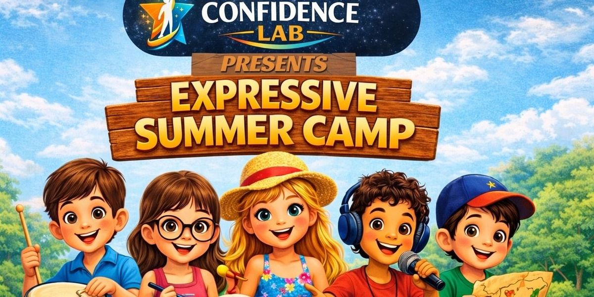 Expressive Summer Camp by The Confidence Lab is a 7-day experiential program for children (6+), focused on building confidence, communication, creativity, and life skills through fun activities like aqua fitness, drumming, coffee painting, music expression, sandcastle building, treasure hunt, and talent showcase.