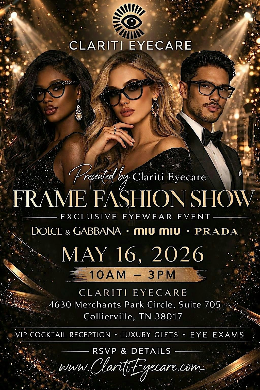 Clariti Eye Care will be hosting the first ever eye wear fashion show featuring luxury lines of Prada Eye Wear, Dolce & Gabbana Eye Wear and ,MiuMiu Eye Wear. We will be showcasing the full 2026 collections of each brand, offering eye examinations, and extending exclusive discounts and offers on eye wear during this event. (Please be sure to schedule a time slot at 901-930-5288 or www.ClaritiEyeCare.com if you need an eye examination) Eye examination can be done prior to the event as space will be limited on the day of the event.
