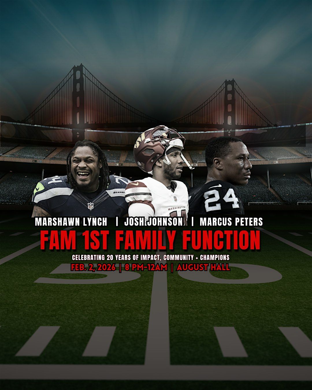 Kick off Super Bowl week with NFL legends and vets Joshua Johnson, Marshawn Lynch, and Marcus Peters as they host a Bay Area function and Celebrity Bartending event to raise funds and celebrate the 20th anniversary of the Fam 1st Family Foundation.