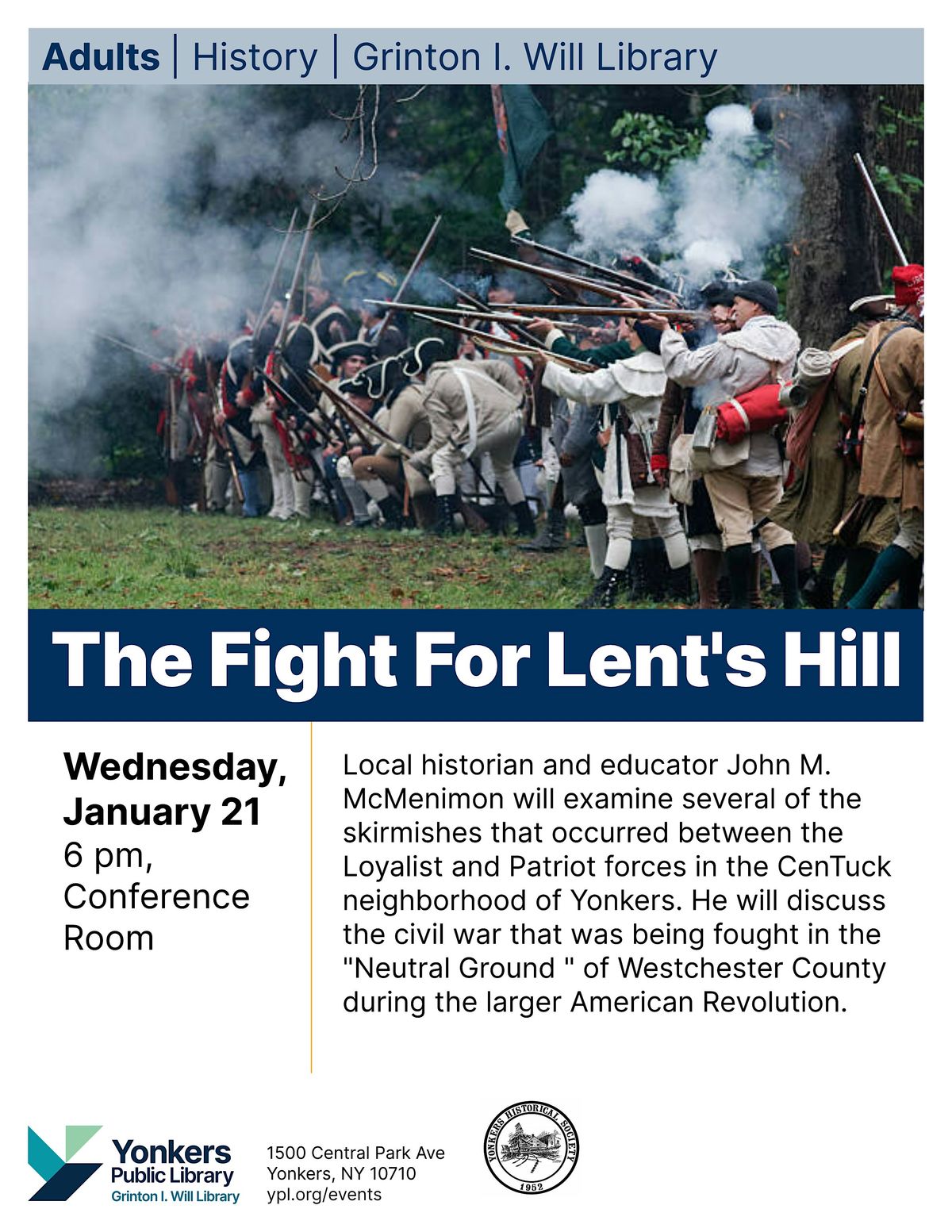 Local historian and educator John M. McMenimon will examine several of the skirmishes that occurred between the Loyalist and Patriot forces in the CenTuck neighborhood of Yonkers. He will discuss the civil war that was being fought in the "Neutral Ground " of Westchester County during the larger American Revolution.