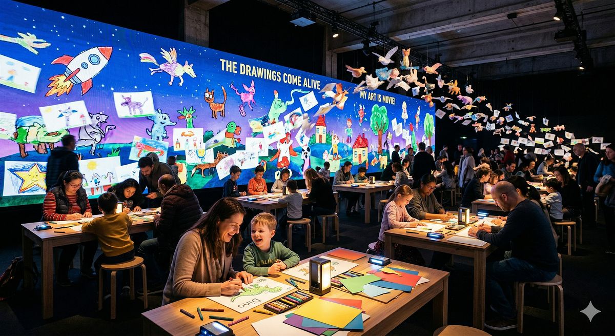 Draw. Animate. Watch. Spend the day drawing together at our giant art tables, guided by our team. Hand us your drawing and watch it transform into an animated character on a giant communal screen — right in front of your eyes, instantly. Draw as many times as you want. Stay as long as you like. This space is yours all day.