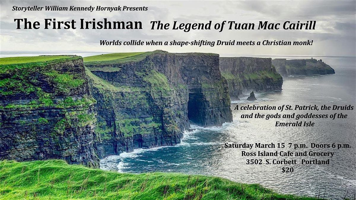 Welcome to The First Irishman - The Legend of Tuan Mac Cairill event! Join us at Ross Island Grocery & Cafe on March 15, 2026, at 7:00 PM to uncover the fascinating tale of Tuan Mac Cairill. Worlds collide when a shape-shifting Druid meets a Christian monk! Prepare to be captivated by Will Hornyak, Portland's celebrated storyteller, and enjoy the magic of Irish folklore in person. See you there!