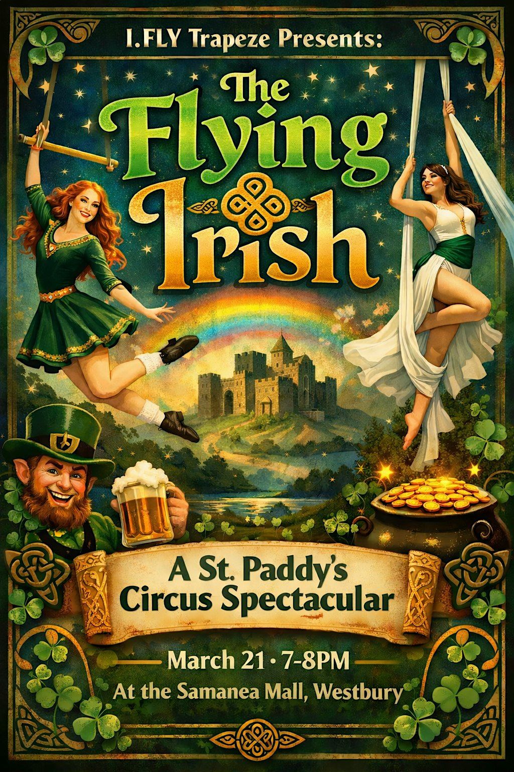 Get ready for a night where the Emerald Isle meets the skies! Join us March 21 from 7–8 PM at I.FLY Trapeze at the Samanea Mall in Westbury for a high-flying celebration packed with thrills and Irish spirit.