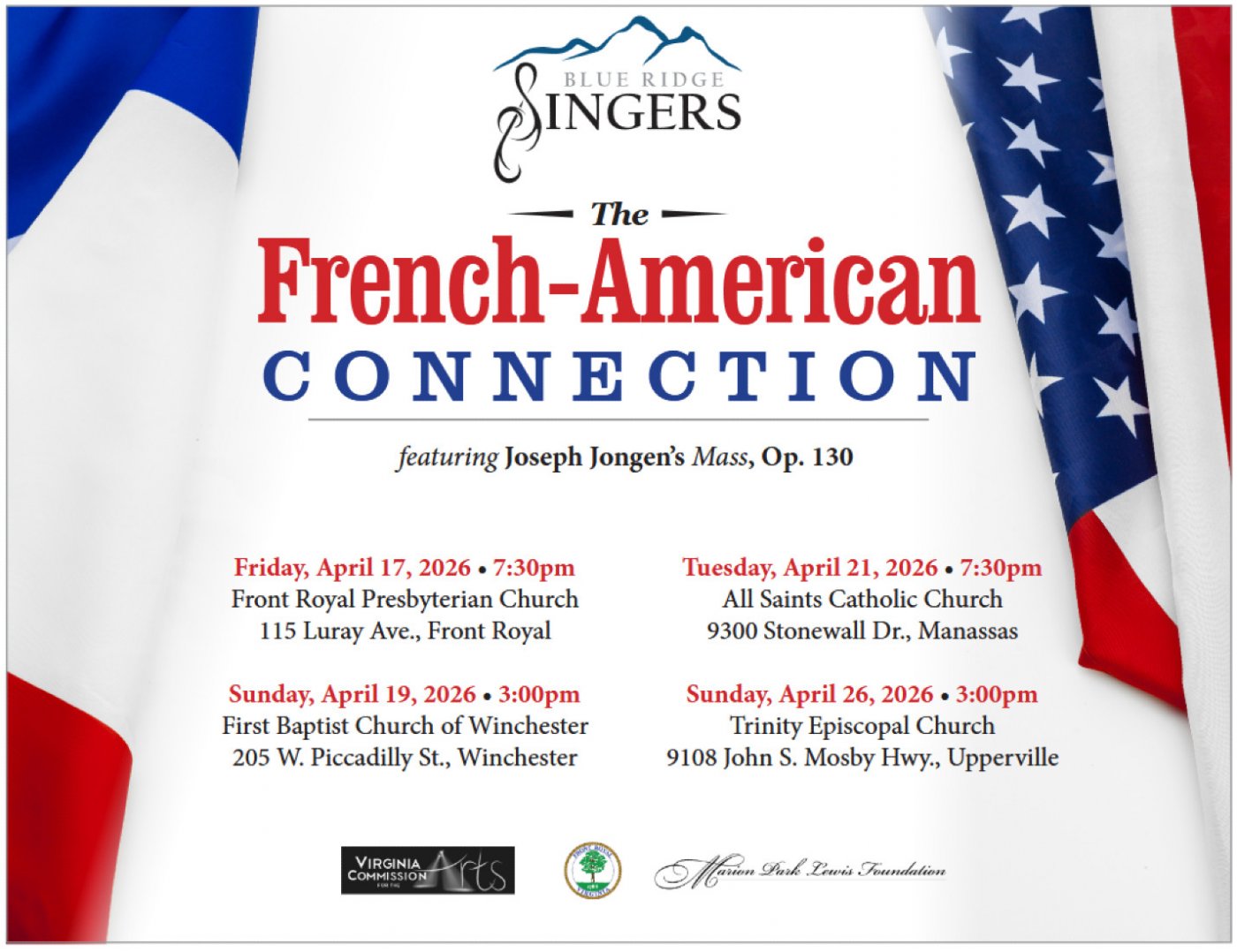 As a part of the 250th anniversary of the founding of the United States of America, Blue Ridge Singers invites you to our concert: The French-American Connection. America has had a close relationship with France across these two and a half centuries and many composers have been influenced by the modern French style, namely French Impressionism, whereby composers attempt to demonstrate color and light through the melodies and harmonies they employ. This concert will feature music by composers David Conte, Alfred Desenclos, Edgar Cosma, and Joseph Jongen. We will feature Jongen’s breath-taking Mass, Op. 130 with organ and brass ensemble in each of our four concert venues. Come, and be uplifted by this beautiful, inspiring music.