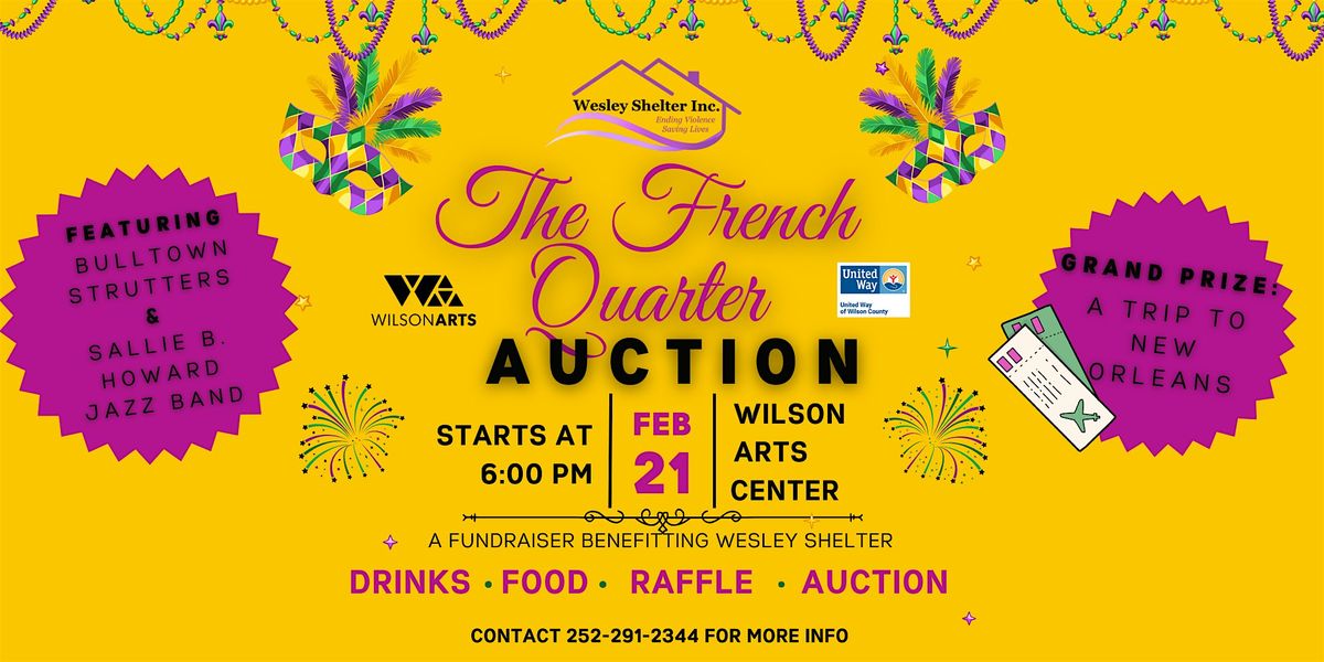 Step into a New Orleans inspired evening that blends celebration with purpose. 🎭✨ The French Quarter Annual Fundraiser brings together jazz, dancing, Cajun food, colorful masks, and community joy, all in support of survivors served by Wesley Shelter. 💜 Guests will enjoy live performances by the Bulltown Strutters and the Sallie B. Howard Jazz Band 🎶, plus themed drinks, a curated auction, and a raffle featuring our grand prize: a trip to New Orleans. ✈️🌃 Dressing up is encouraged, and the best dressed guest wins a prize. 👑 All proceeds fuel safety, advocacy, and healing for survivors in Wilson County. 🙌 Event is 21+ All tickets include 1 free drink ticket and 5 free raffle tickets.