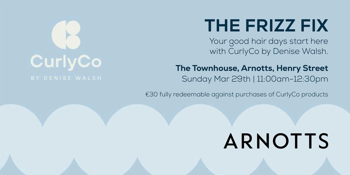 Terms and conditions: €30 redeemable on CurlyCo products, in Arnotts store on the day of event only. By purchasing ticket(s) for this event you agree (on your own behalf and on behalf of any guests attending with you) to be bound by Brown Thomas Arnotts Terms & Conditions which can be found at