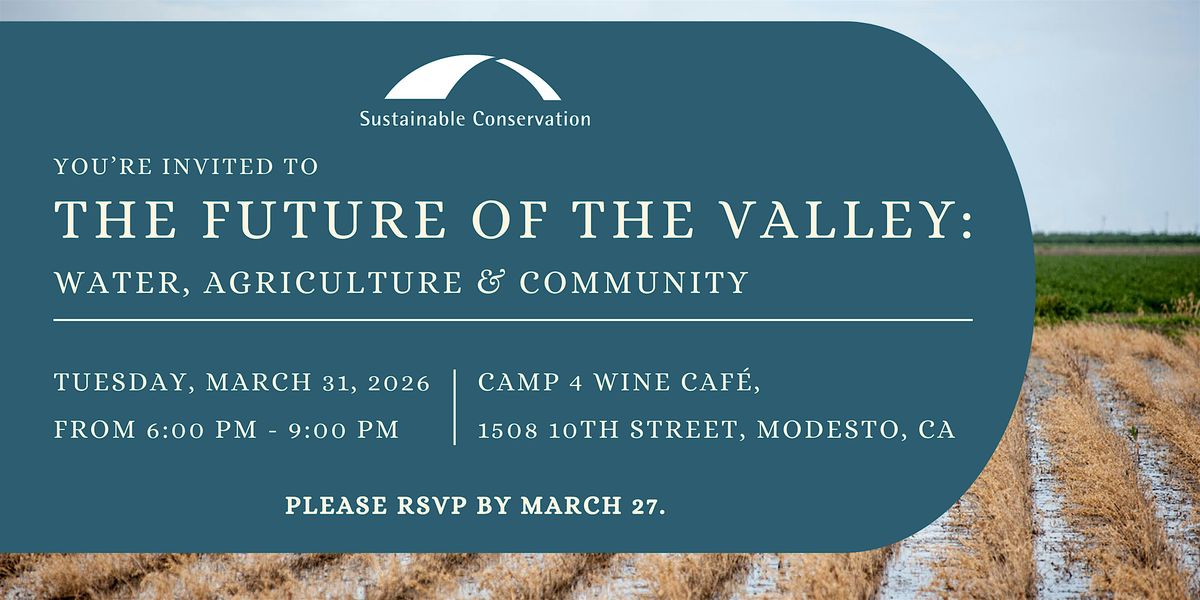 Through a brief discussion with Sustainable Conservation and regional leaders, we’ll explore how water management, community engagement, and working lands strategies shape a future that works for agriculture, the community, and the broader economy. We’ll touch on what’s changing, what’s working, and how collaboration continues to move the Valley forward.