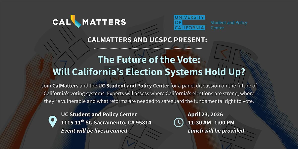 Join CalMatters and the UC Student and Policy Center for a panel discussion on the future of California's voting systems. Experts will assess where California's elections are strong, where they're vulnerable, and what policy changes might impact the fundamental right to vote.