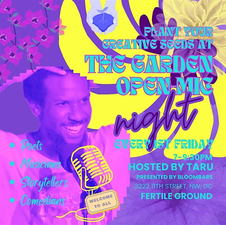 Join us for our magical monthly variety open mic (poetry, music, comedy, storytelling, etc.) where the show is appropriate for all ages (please and thank you to performers). Plant your creative seeds at The Garden Open Mic, Hosted by Taru Marcellus. Doors open at 6:30 pm. Sign-Up starts at 7:00 pm. The first performer goes on at 7:15 pm!