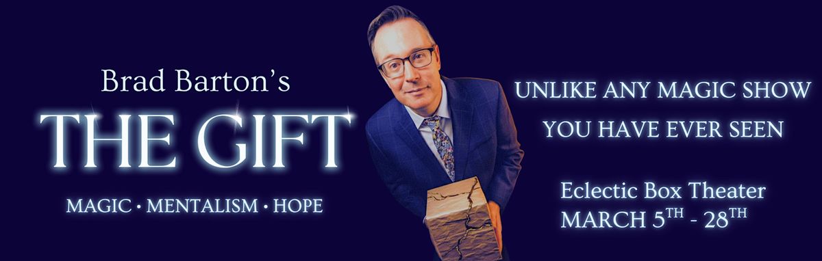Magician and mentalist, Brad Barton brings you his most personal show yet with The Gift, an intimate magical performance that examines the relationship between gratitude and adversity. Asking the question, “can we be thankful for the more challenging moments in our lives?”, while also exploring the boundaries of what a “magic show” can actually be. Join us for an engaging and interactive experience that weaves together storytelling, illusions and mind reading from March 5th - March 28th at Eclectic Box Theater.