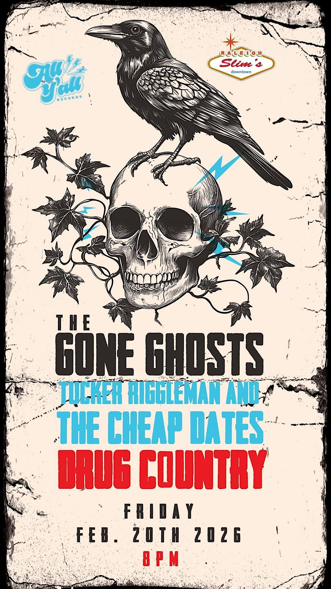 The Gone Ghosts, Tucker Riggleman and The Cheap Dates, and Drug Country are playing Slim’s on February 20th from 8-11pm! The Gone Ghosts are an alt-country Americana/rock band out of Carrboro, NC, blending raw storytelling with a sound steeped in love, loss, and heartache. Fronted by singer, guitarist, and songwriter Dave Hedeman, formerly of East Coast college favorite Puddleduck and later The Vagabond Union, the band also features bassist Dillon Partin, guitarist/vocalist Justin Bowlin, and drummer Scott Jones. Inspired by a chance encounter with Jason Isbell that reignited his passion for music, Dave formed The Gone Ghosts in 2018 to lean into the alt-country sound closest to his heart. With rootsy guitars, heartfelt lyrics, and a sound that hits somewhere between a honky-tonk and a rock club, The Gone Ghosts bring the kind of Americana grit that feels right at home on Slim’s stage. Joining the night is Tucker Riggleman and The Cheap Dates, and Drug Country!