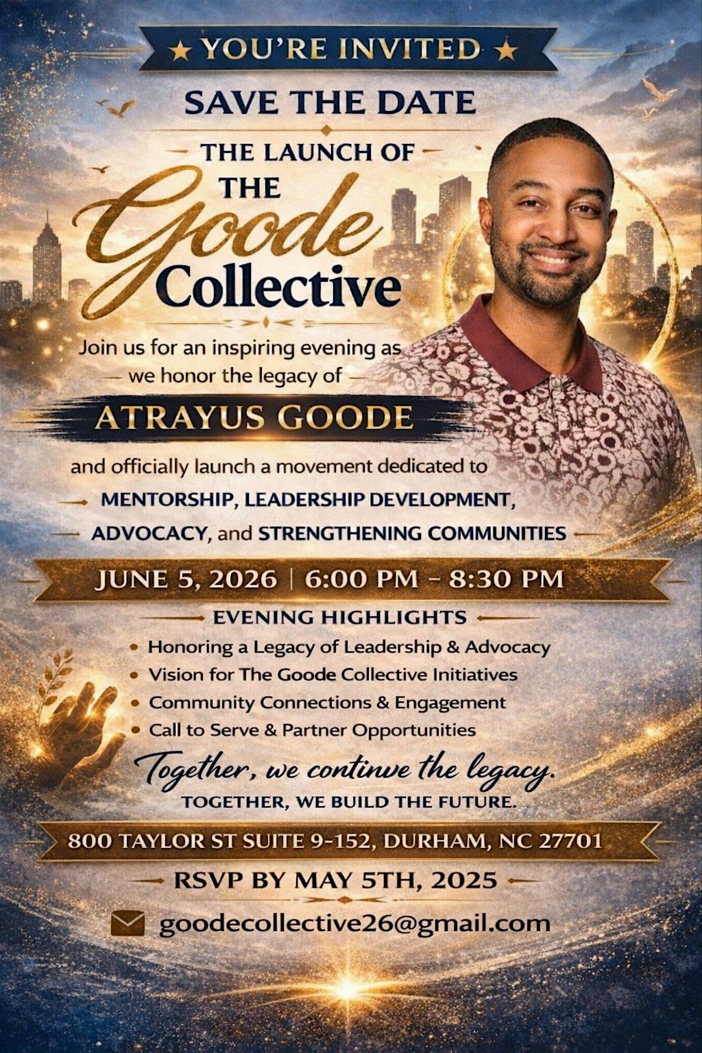 Join us for a powerful and inspiring evening as we officially launch The Goode Collective, an initiative dedicated to continuing the legacy of Atrayus Goode — a leader, mentor, and advocate who was deeply committed to uplifting youth and strengthening communities.