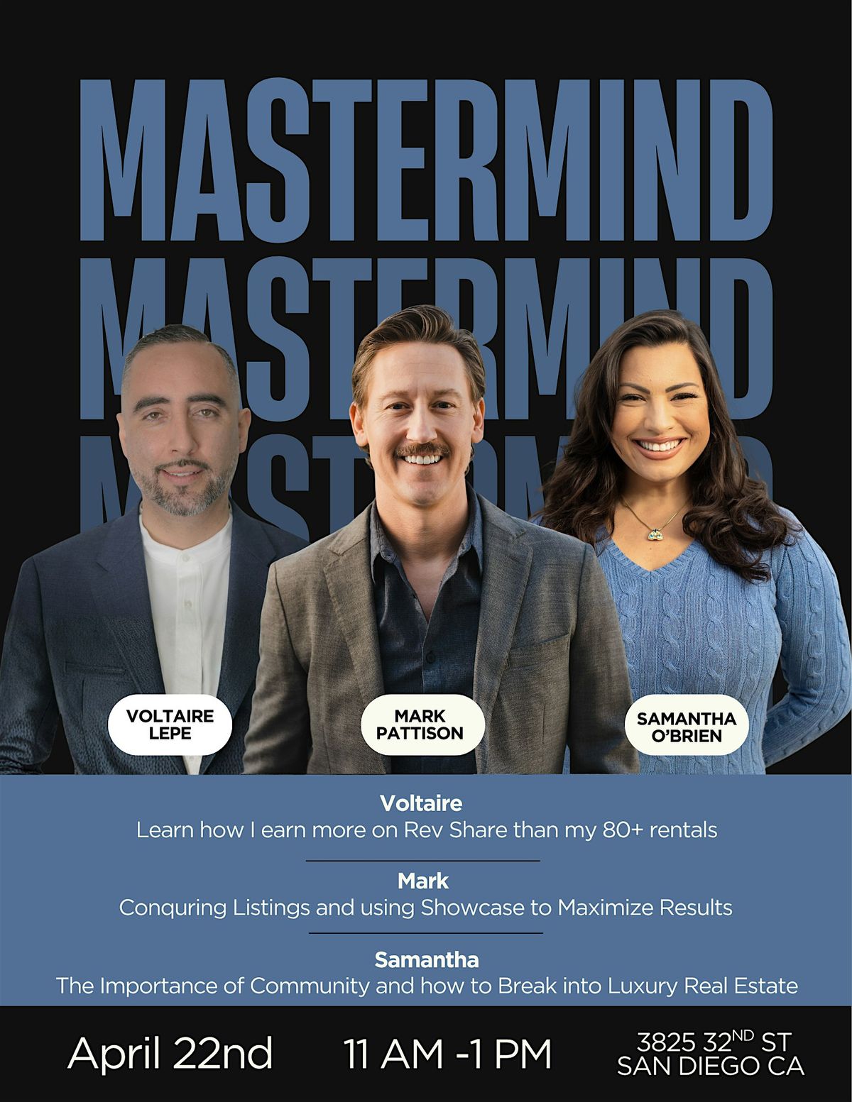 Join us for a high-impact mastermind designed for real estate agents who want to grow smarter and faster. Hear from Voltaire Lepe, Mark Pattison, and Samantha O’Brien as they share real-world strategies for building revenue through rev share, winning more listings, maximizing Zillow Showcase, and breaking into luxury real estate through authentic community connections. This mastermind is built for agents who want practical ideas, better conversations, and a clearer path to bigger business.