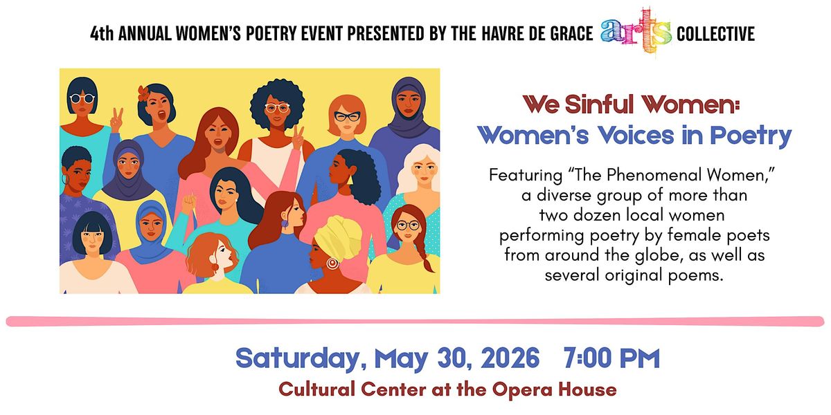 HAVRE DE GRACE ARTS COLLECTIVE’S 4th ANNUAL WOMEN’S POETRY EVENTA diverse group of more than two dozen local women will perform poetry by female poets from around the globe, as well as several original poems.