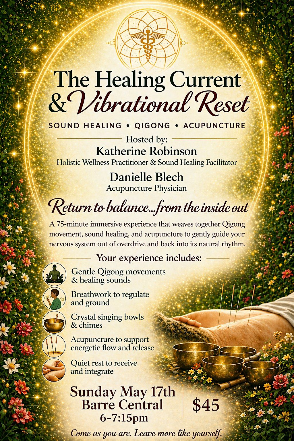 This 75-minute immersive experience weaves together Qigong movement, Sound healing and Acupuncture to gently guide your nervous system out of overdrive and back into natrual rhythm.