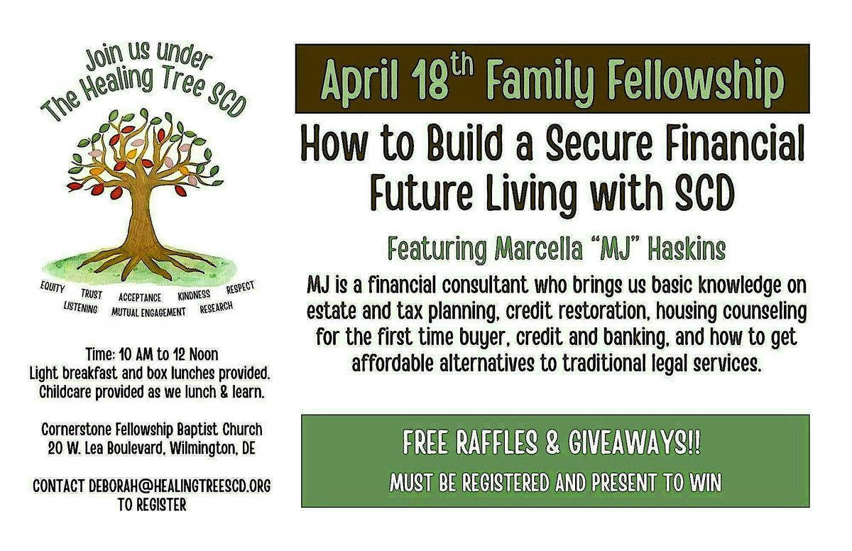 Join us at The Healing Tree SCD Family Fellowship, "How to build a Secure Financial Future Living with SCD" event for a day filled with love, Support, Education and Connection for individuals and families affected by Sickle Cell Disease (SCD). This quartly, in-person gathering, aims to create a space where you can find comfort, resourses, and a sense of community.