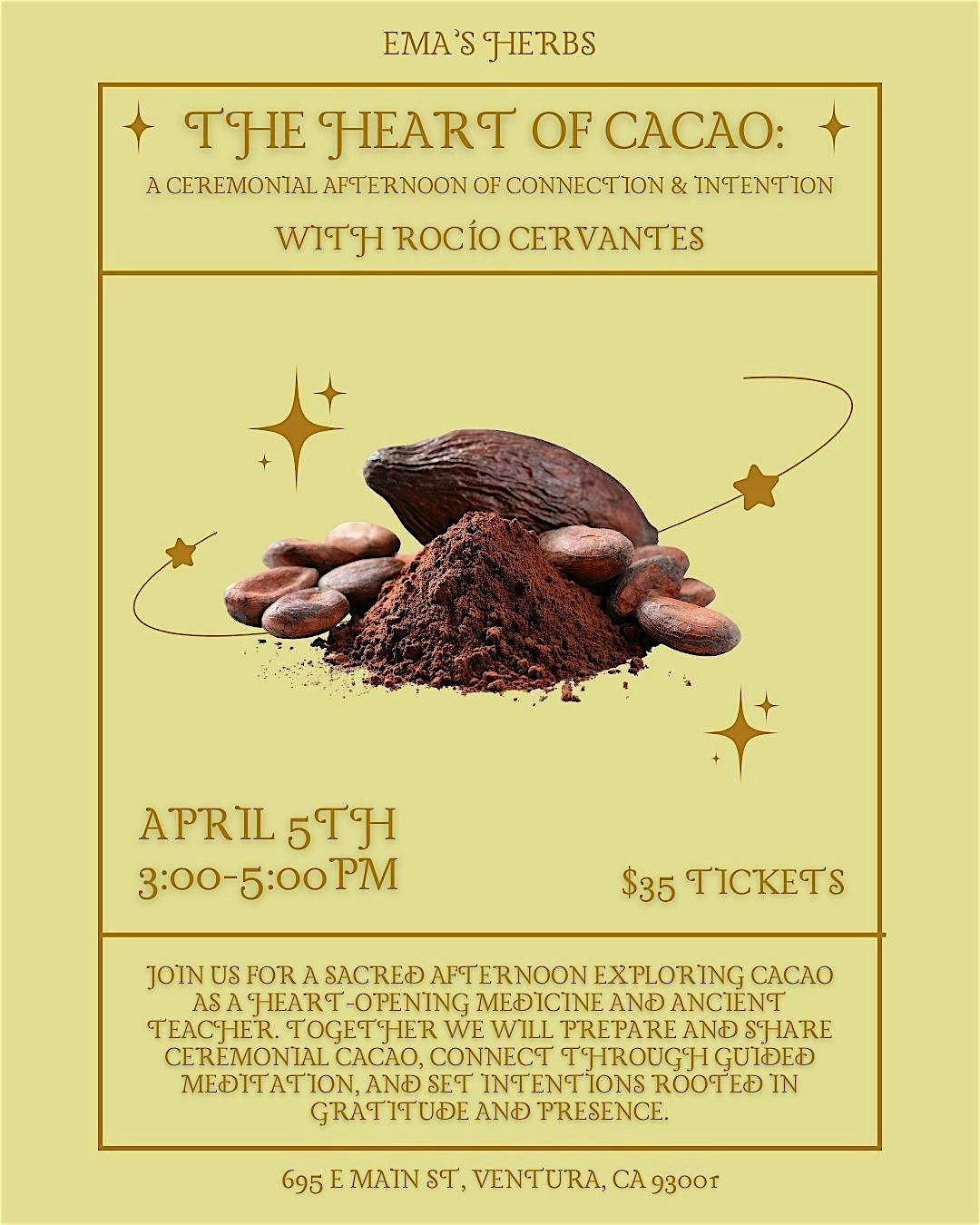 Join us for a sacred afternoon exploring cacao as a heart-opening medicine and ancient teacher. Together we will prepare and share ceremonial cacao, connect through guided meditation, and set intentions rooted in gratitude and presence. Participants will learn about the cultural and energetic roots of cacao as honored by Mesoamerican communities and experience its gentle ability to awaken the heart, calm the mind, and restore harmony within.