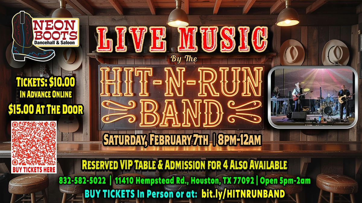 Get your Tickets in Advance Online TODAY at a discount to BOOT SCOOT around the dance floor to LIVE Country Music from the HIT N RUN Band at Neon Boots Dancehall & Saloon on Saturday, February 7th!