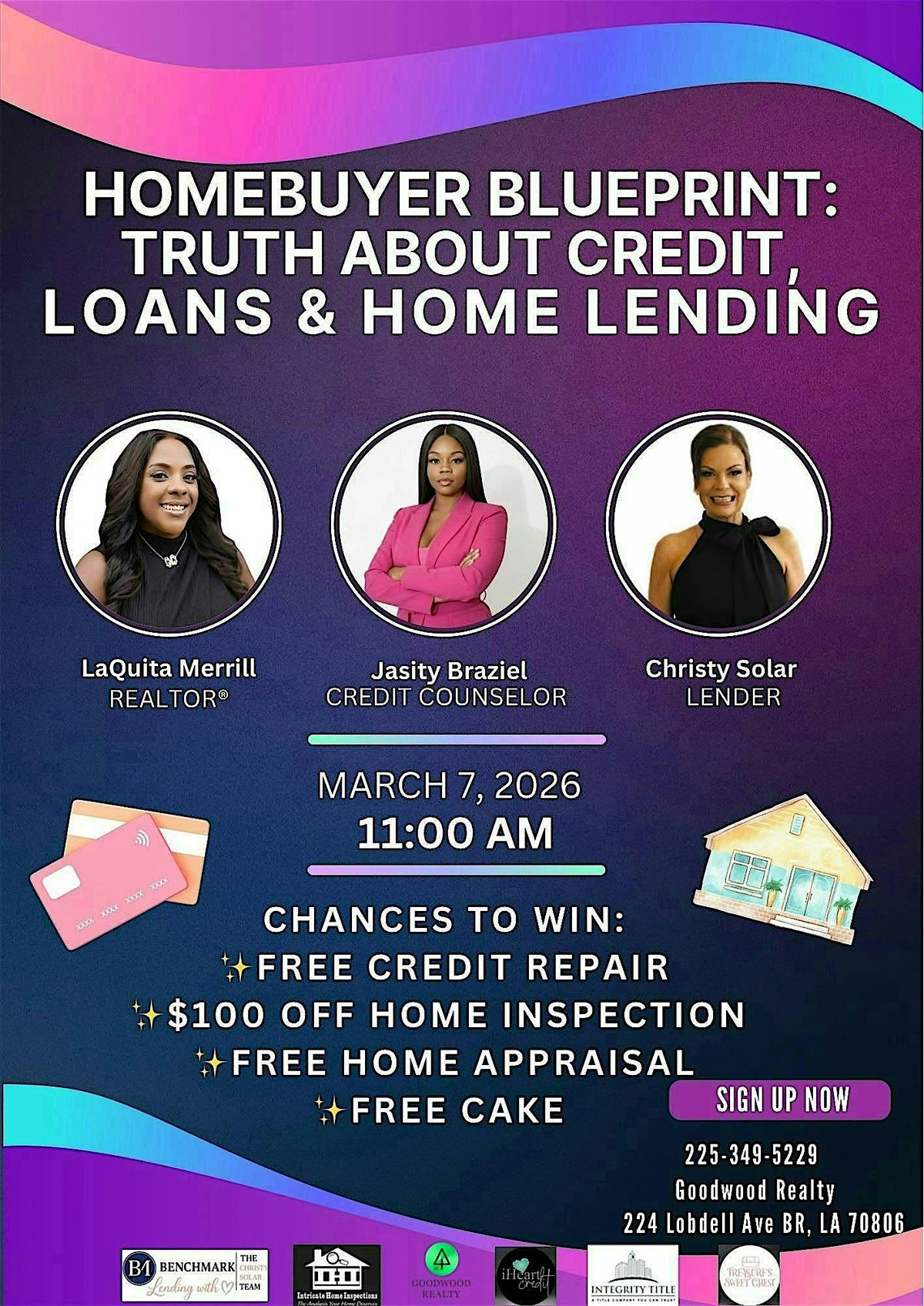 The Homebuyer Blueprint is an educational class designed to break down the truth about credit, loans, and the home lending process in a clear, simple, and judgment-free way. Whether you’re just starting to think about buying a home or you’ve been told “not yet,” this session will help you understand what lenders really look for, how your credit impacts your buying power, and what steps you can take right now to move closer to approval. Attendees will leave with realistic expectations, practical guidance, and a clear roadmap toward confident homeownership—plus enjoy food, giveaways, and a welcoming environment to ask questions and connect.