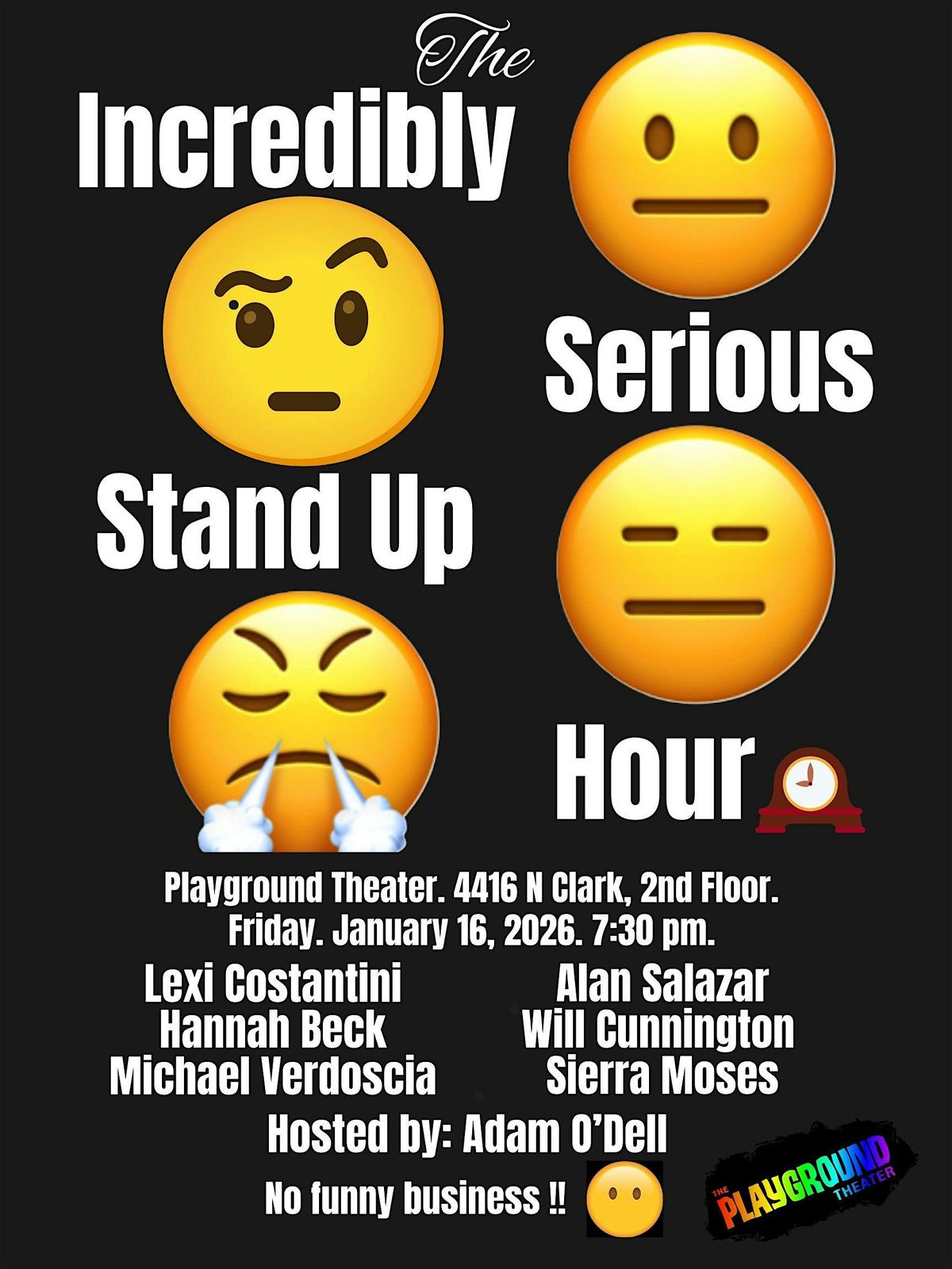 Join host Adam O'Dell and seriously taleted line-up of comedians including Michael Verdoscia, Lexi Constantini, Alan Salazar, WIll Cunnington, SIerra Moses, and Hannah Beck for a strictly good night of stand-up at The Playground Theater.