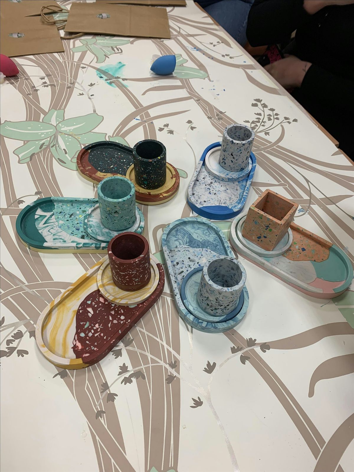 In this 2-hour workshop you will be taught step by step, with demos on how to create a Jesmonite Oval Trinket Tray using Terrazzo, Marbling & Block Colour techniques. We will be creating a mini pot & ring dish in addition to the trinket tray, so you get to learn all the techniques & create a full home decor set!