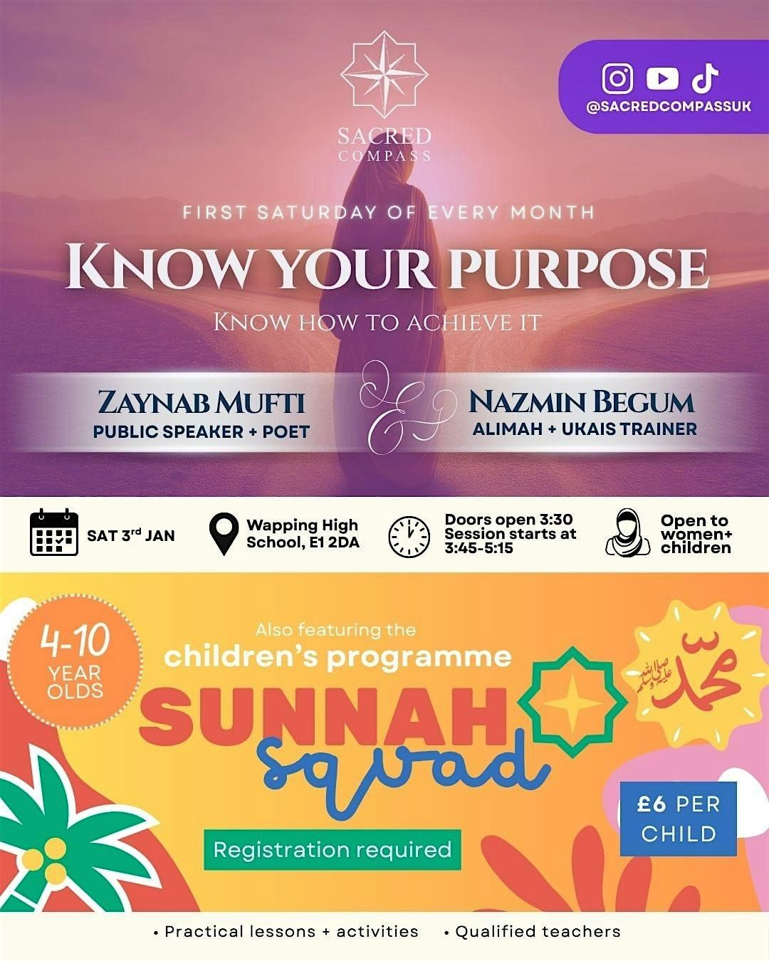 This new year start a fresh with Sacred Compass. Join our esteemed Ustadahs for an enlightening session where we dive deep into discovering our purpose in life. The event will be an opportunity to connect with like-minded individuals and explore the path to self-discovery. Tickets are free for this session. Children aged 4-10 are encouraged to attend the SC Sunnah Squad session below (separate tickets required).
