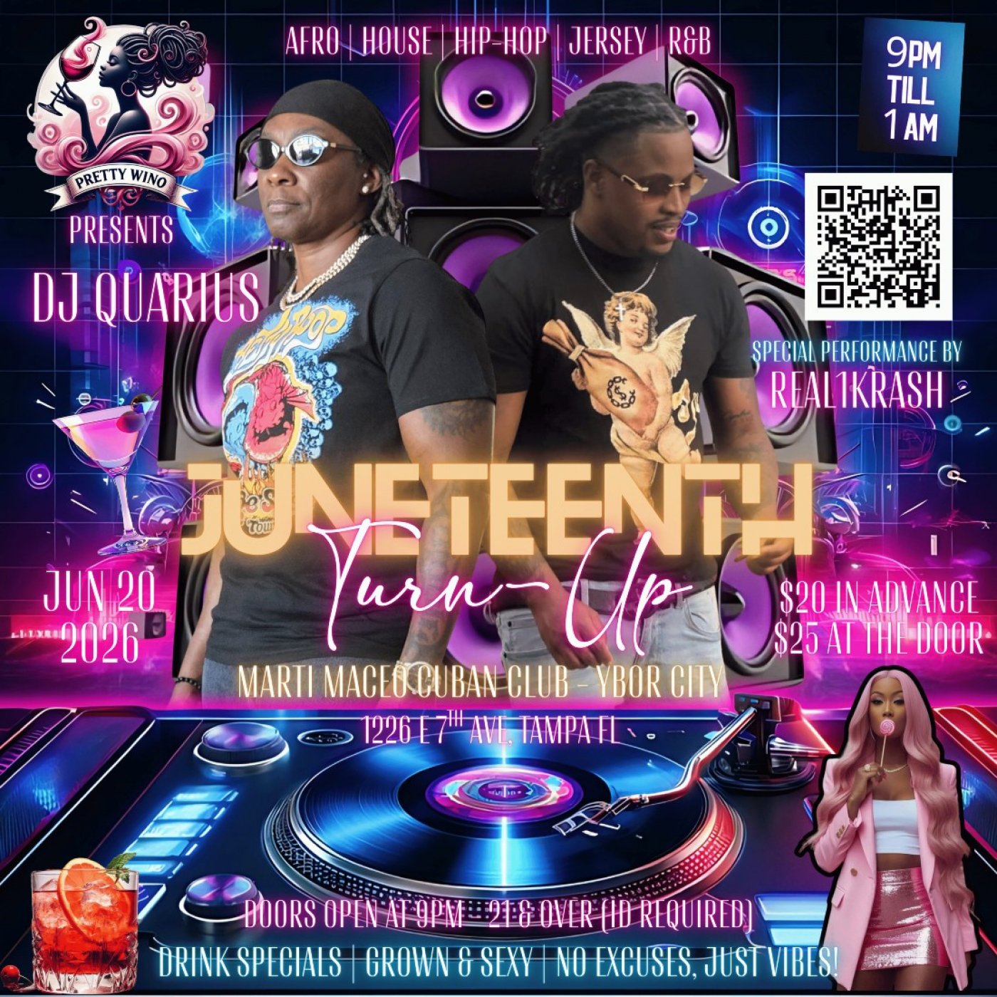Juneteenth Turn Up is a high-energy celebration of freedom, culture, and community happening June 20th at the iconic The Marti Maceo Cuban Club. This event brings Tampa Bay together for a night of music, unity, and unapologetic joy as we honor the meaning of Juneteenth in a vibrant, uplifting atmosphere.