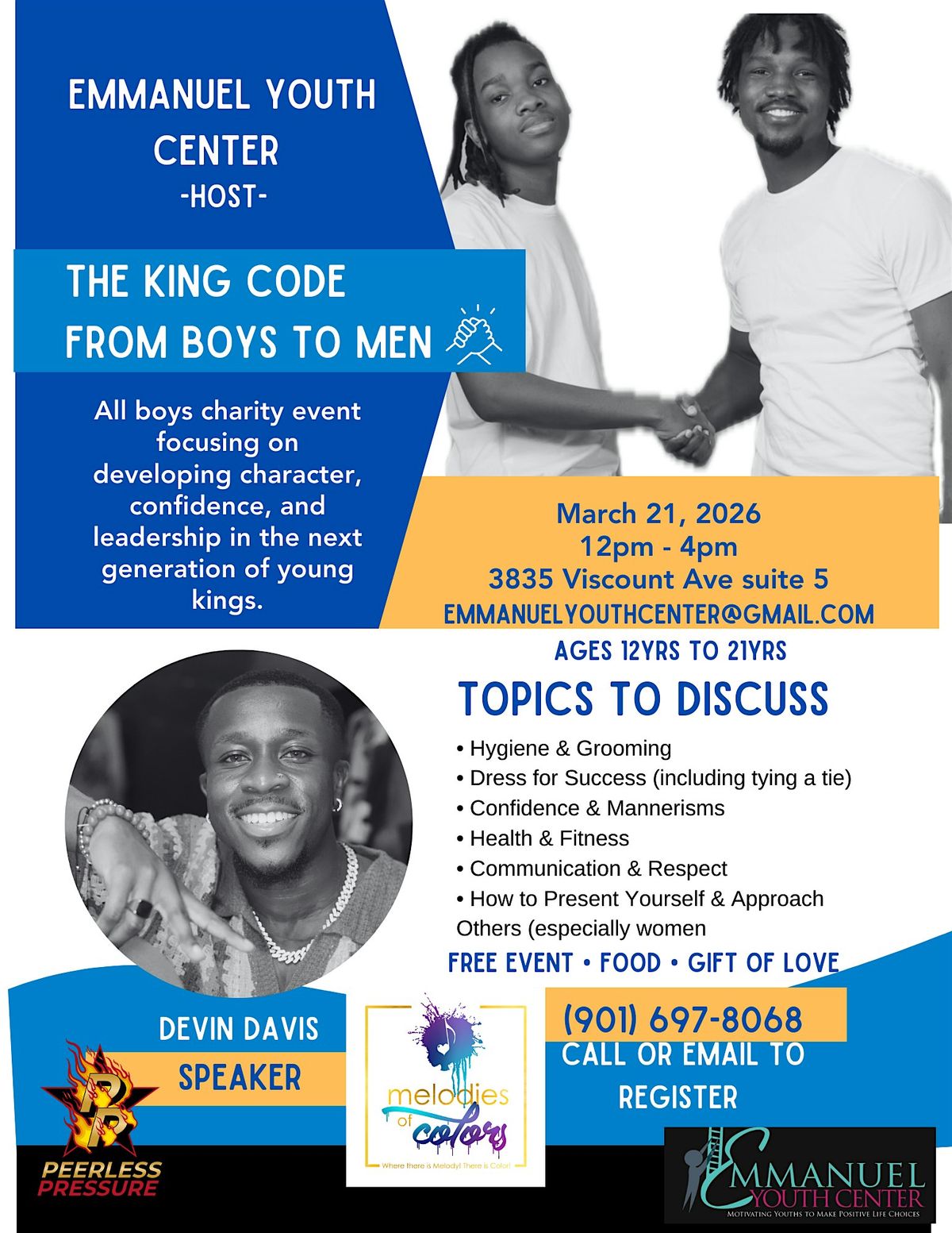 The King Code: From Boys to Men is a free all-boys youth empowerment event hosted by Emmanuel Youth Center. This experience is designed to help young men build character, confidence, and leadership skills while learning what true manhood looks like.