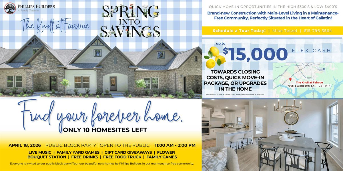 Phillips Builders invites you to our Spring Into Savings Public Block Party - a lively, family-friendly event where you can explore beautiful new homes while enjoying an afternoon of entertainment and community.