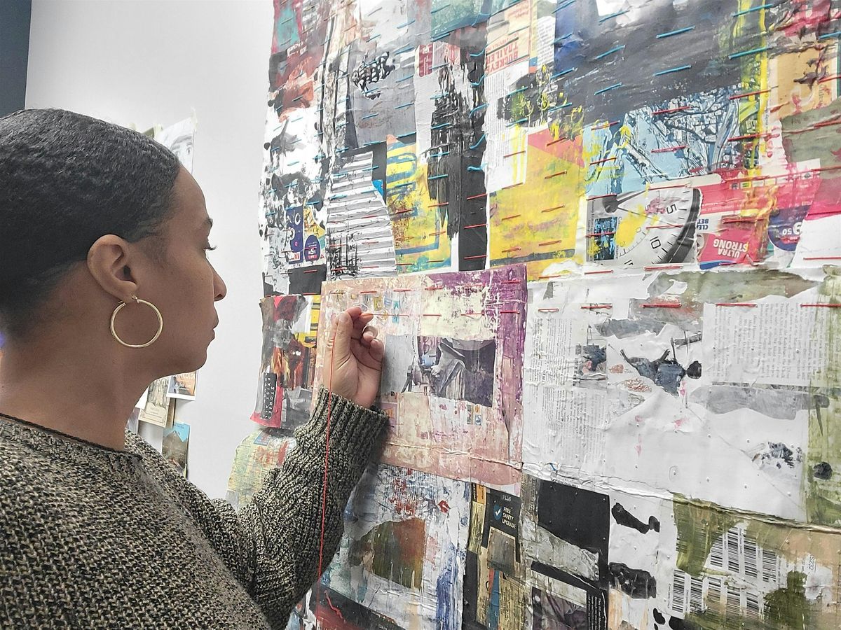The piece "Trainwreck" by Althea Jones has been in the works since early 2023 and is nearing completion. During a 48 hour lock-in at Curated Storefront in Akron, Ohio, Althea will complete the piece by hand sewing a perfect grid into the existing collage representing the perameters of percieved perfection that we attempt to use to correct the chaos we create.
