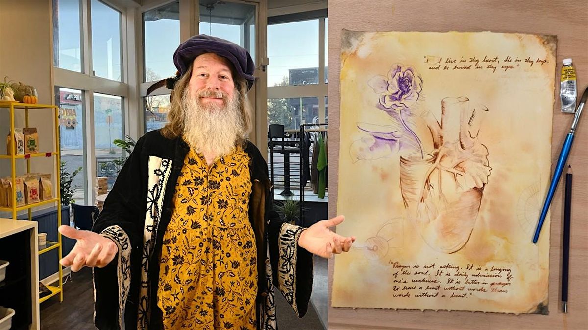 Leonardo will lead you in recreating your own 11 x 14 page of the Renaissance maestro's legendary notebooks. We'll lead you step by step to create the example painting you see here (which includes sketches actually drawn by Leonardo), with lots of room for variations (and other Leonardo sketches) if you feel inspired to explore your own creativity.