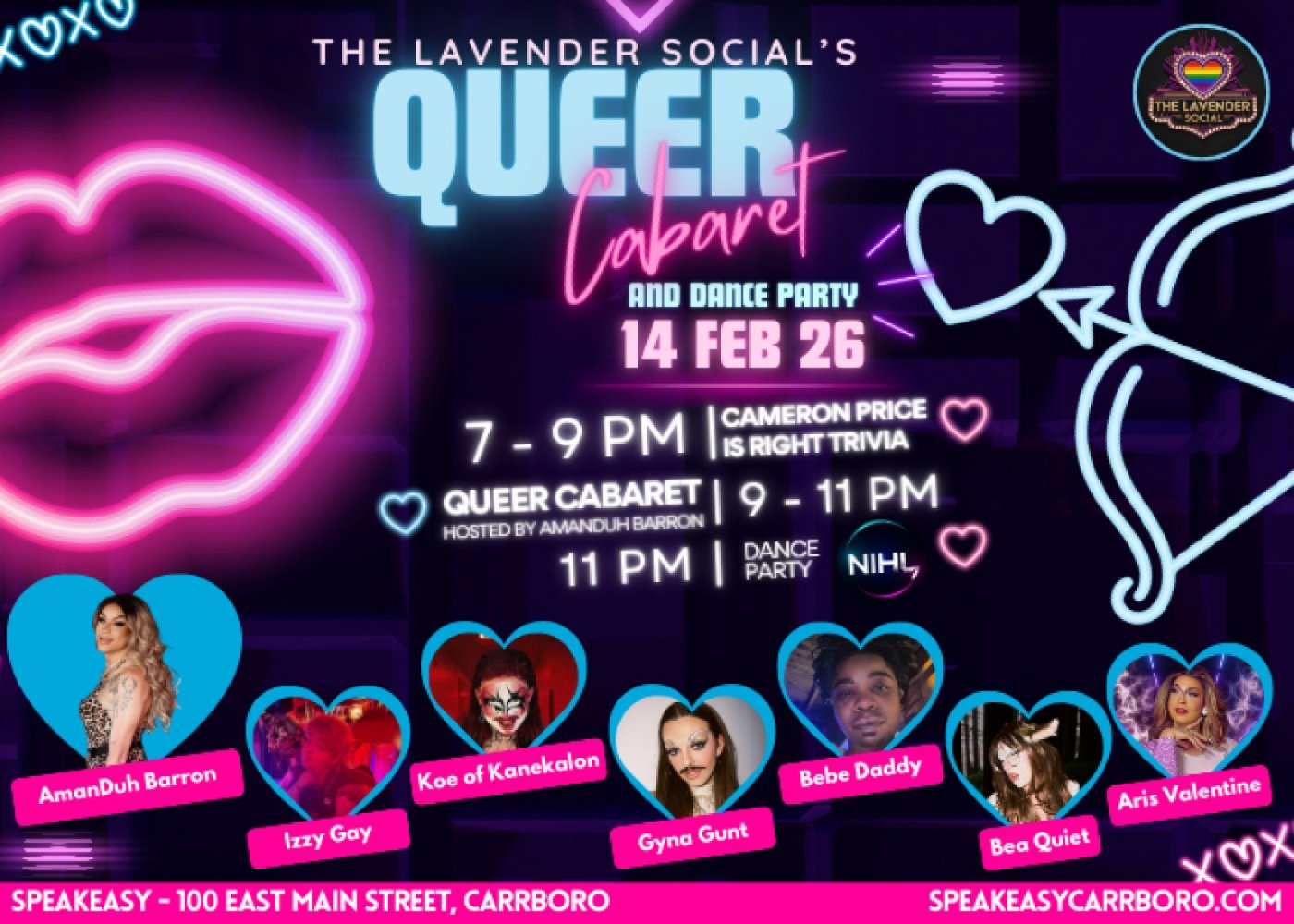Celebrate the season of love with The Lavender Social for an unforgettable night of community, fabulous performances, and dancing at Speakeasy Carrboro! Whether you’re celebrating with a partner, your chosen family, or your wonderful self, we’re bringing you a jam-packed Saturday that starts with high-stakes trivia, moves into a glittering cabaret, and ends with a high-energy dance floor.