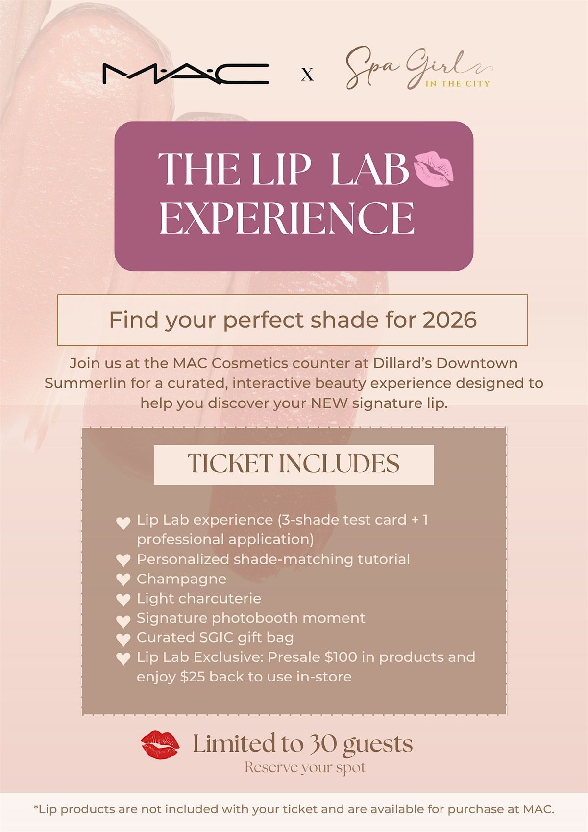 Join MAC Cosmetics x Spa Girl in the City™ for an elevated, hands-on beauty experience designed to help you discover the lip that feels effortless, flattering, and completely you.