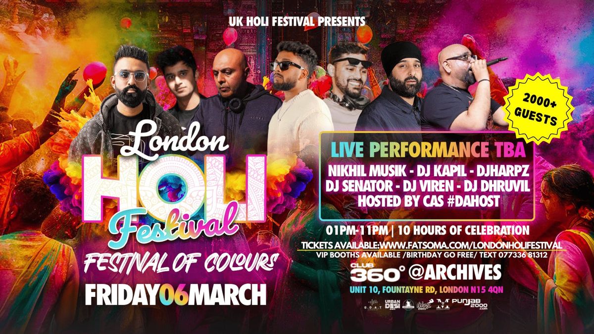 📅 - 6TH MARCH | FRIDAY📍- CLUB 360 @ ARCHIVES, Unit 10, The High Cross Centre, Fountayne Rd, London, N15 4QN🕒TIMINGS- 12:00PM - 3:00AM | 9 HOURS- FULL OF COLOURS & UNLIMITED FUNJoin us for an unforgettable experience as we bring together 3000+ ravers with a day full of organic colors, live performers, and so much more. This isn't just a party, it's a vibrant explosion of energy and joy!Join us as we usher in the arrival of spring with an explosion of colors, music, and laughter.Sold out last year with over 1,500 attendees. This year, we're back Even bigger and better with 3,000 ravers! 🚨🚨 WHAT TO EXPECT 🚨- ORGANIC HOLI COLOURS THROUGHOUT THE EVENT💥- 3000+ RAVERS 💦- VARIETY OF DRINKS AND FOOD OPTIONS AVAILABLE 🍕🥤- LIVE DJs & PERFORMERS TBA🎚️🎛️- STATE OF THE ART SOUND SYSTEMS 🎵- LIGHTING & LAZERS ⚡️Here's your exclusive invitation to a historic gathering – the talk of the town and the biggest event of the year! Claim your spot now and be a part of the excitement that everyone will be talking about.Get ready to indulge in irresistible flavors at our food stalls!We’ve lined up vibrant color stalls, vape stalls & MORE to make your LONDON Holi Festival extra special!